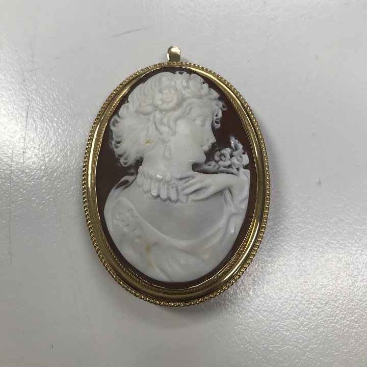 まずカメオの価値について。こちらは非常に残念ではありますが、余程有名なデザイナー・作家が作った物以外はほとんど+αとしてのお値段が付かず、ほとんど地金(枠の貴金属)のみ査定額となります。例え、大ぶりのシェルやストーンカメオだったとしてもです。